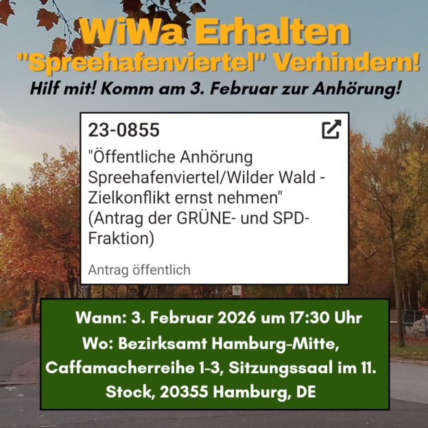 Im Bezirksamt Mitte findet am Dienstag, dem 3. Februar eine Öffentliche Anhörung zum Thema „Zielkonflikt Spreehafenviertel/Wilder Wald“ statt, um die Politiker*innen zu informieren, die später über die Vernichtung des Waldes entscheiden werden. Dazu sind vier Expertinnen geladen und auch das Publikum darf Fragen stellen.